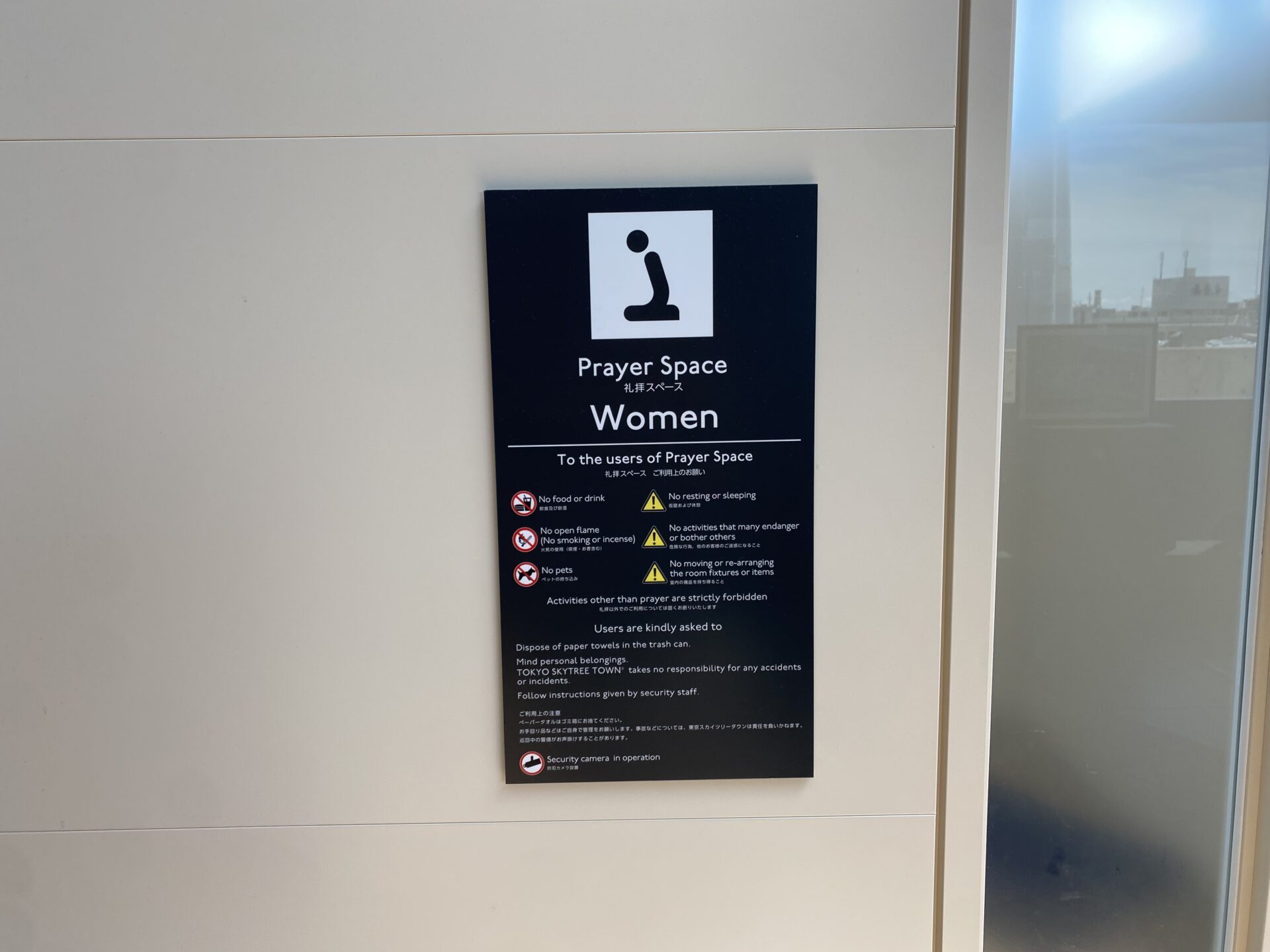 Or you can use a prayer spaces in the Sky Tree instead. There is a spacious space for prayers in the Sky Tree that everyone can use without registration.
